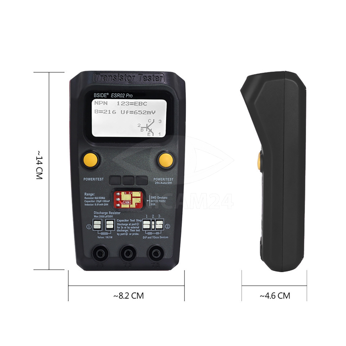 BSIDE ESR02PRO портативный тестер, предназначенный для инженеров и специалистов по электронному обслуживанию оборудования. Тестер значительно облегчает работу с компонентами для поверхностного и сквозного монтажа, а также тестировать различные типы диодов, тиристоров, МОП- транзисторов и прочие. Преимущества: Автоматическое определение типов: биполярных транзисторов NPN и PNP, полевых МОП-транзисторов с N- и P-каналом, полевых транзисторов JFET, диодов, двойных диодов, тиристоров и триаков. Измерение коэффициента усиления биполярных транзисторов (hFE) Измерение порогового напряжения база-эмиттер биполярных транзисторов. Обнаружение защитного диода биполярных транзисторов и полевых МОП-транзисторов. Измерение порогового напряжения затвора и значения емкости затвора MOSFET транзисторов. Время измерения: около 2-х секунд (для больших конденсаторов и индуктивностей может быть больше). Три контейнера для размещения мелких компонентов. Гнездо для различных типов корпусов деталей. Гнездо для разряда конденсаторов. Таблица качества электролитических конденсаторов по значению ESR (для справки) на задней крышке.